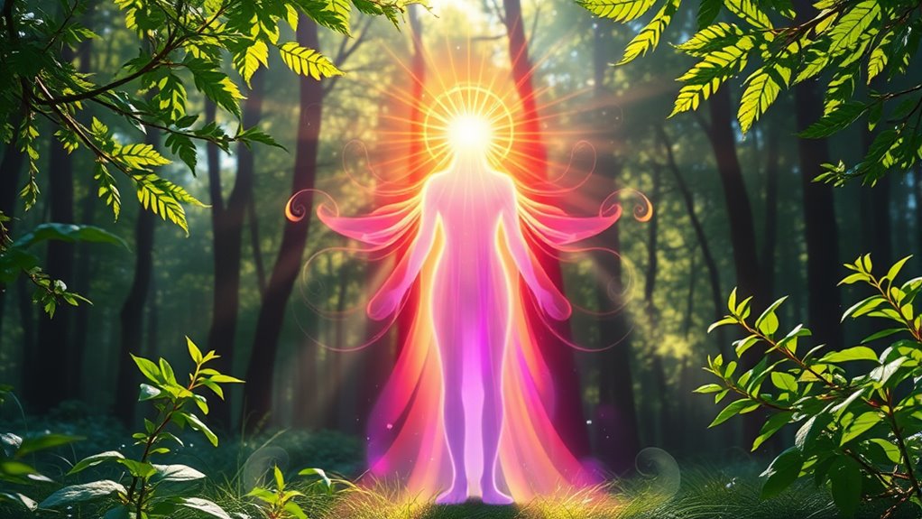 To strengthen and protect your aura, focus on energy cleansing with sage or visualization to clear negative influences, and balance your chakras through meditation or yoga to improve your overall energy flow. Cultivate a positive mindset with gratitude and affirmations, and use protective crystals like black tourmaline or amethyst to absorb negativity. Visualize a shield of light around you and set clear boundaries—practicing these steps regularly helps maintain a vibrant, resilient aura that shields your well-being. Keep exploring for more ways to enhance your energy field.