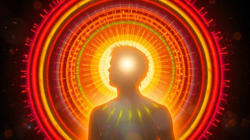 Like a vintage camera capturing a moment in time, aura photography reveals that rainbow auras aren’t visible to everyone naturally. While some people can see or sense them, most need tools like aura photography to perceive these vibrant colors. Color therapy often uses rainbow hues to promote healing. So, unless you’re gifted or use special techniques, you won’t see a rainbow aura with your naked eyes, but it’s definitely accessible through specific methods.