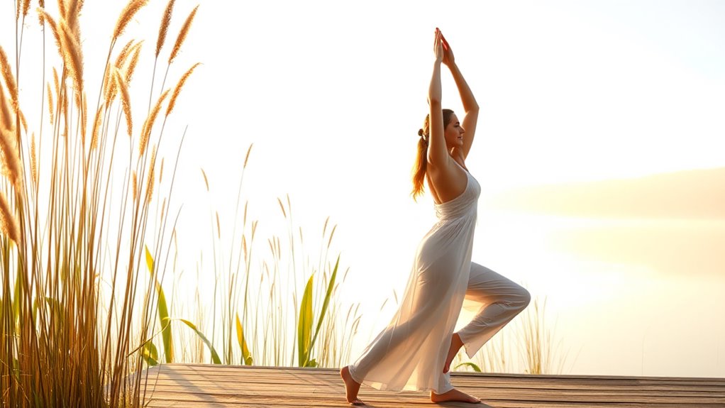 Start your morning with a breath-centered yoga flow to boost your energy and set a positive tone for the day. Incorporate gentle, dynamic movements like sun salutations, breathing deeply with each pose to energize your body and clear your mind. Focus on synchronizing your breath with your movements to maximize vigor and focus. Ending with a brief meditation helps carry this energy forward. Keep going to discover simple ways to enhance your practice and stay energized all day.