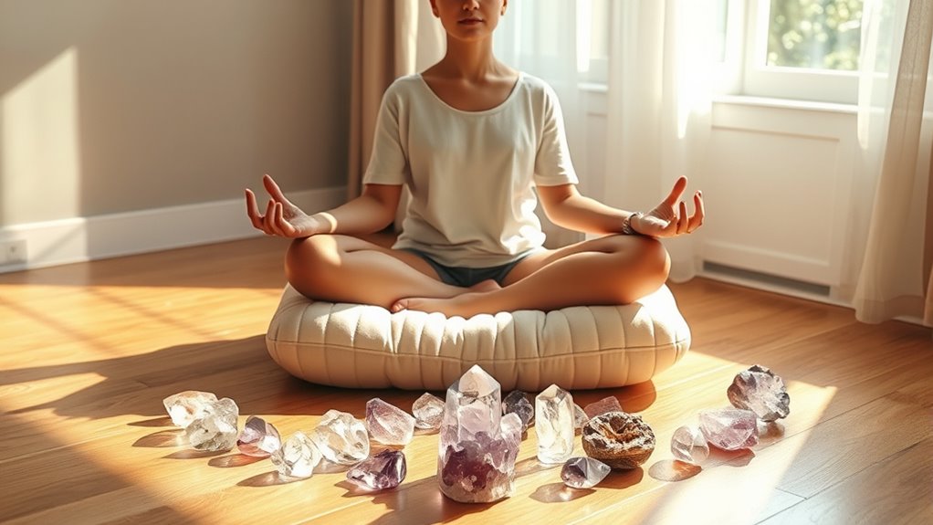 You should meditate with crystals daily or several times a week to maintain crystal activation and deepen your connection. Create a peaceful meditation environment by setting up a quiet space, perhaps with soft lighting and calming music. Consistent practice helps you harness your crystals’ energy, making your meditation more effective. Trust your intuition to determine the best frequency, and always listen to your body’s needs to avoid overdoing it.