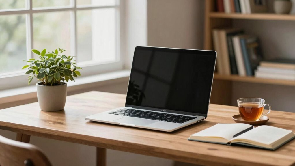 To handle digital distractions during work, start by decluttering your digital space—close unnecessary tabs and organize files. Use focus enhancement tools like website blockers to limit interruptions. Turn off non-essential notifications and set specific times for checking emails and messages. Creating a dedicated workspace also helps maintain focus. By reducing digital clutter and controlling distractions, you’ll improve your concentration and work more mindfully, making your digital life more productive and less stressful.
