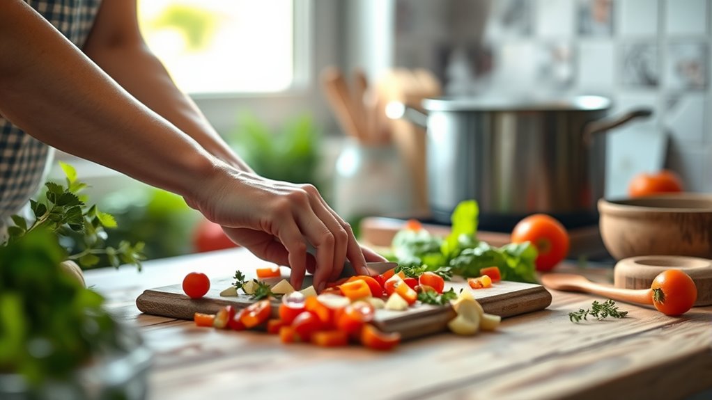 To practice mindfulness during meal preparation, slow down and pay full attention to each step. Notice the textures, smells, and sounds as you chop, stir, and season. Engage all your senses to create a calming presence and turn cooking into a ritual of gratitude and focus. By staying present, you transform routine tasks into moments of meditation. If you explore these techniques further, you’ll discover even richer ways to connect with your food and yourself.