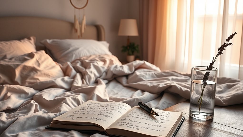 To improve your dream recall, focus on maintaining good sleep habits like going to bed and waking at consistent times, avoiding screens and caffeine before sleep, and creating a peaceful sleep environment. Keep a journal or voice recorder nearby to document dreams immediately after waking, and stay still with your eyes closed to prevent forgetting details. Practicing lucid dreaming and focusing on dream elements can also boost awareness. Continue exploring these techniques to uncover even more about your dreams.