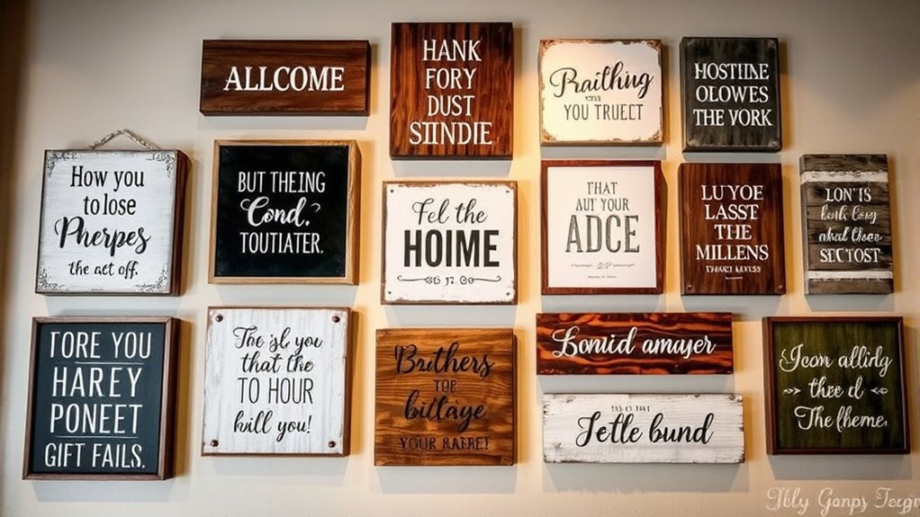 Think of your decor as a storybook, and signs are the punctuation marks that add personality. I suggest choosing signs that match your color palette and style—rustic wood signs for cozy themes or sleek metal for modern spaces. Place them where they’ll be seen—above mantels, entryways, or shelves—and layer them with other decor. This keeps your space cohesive and shows your personality without overwhelming your existing theme.