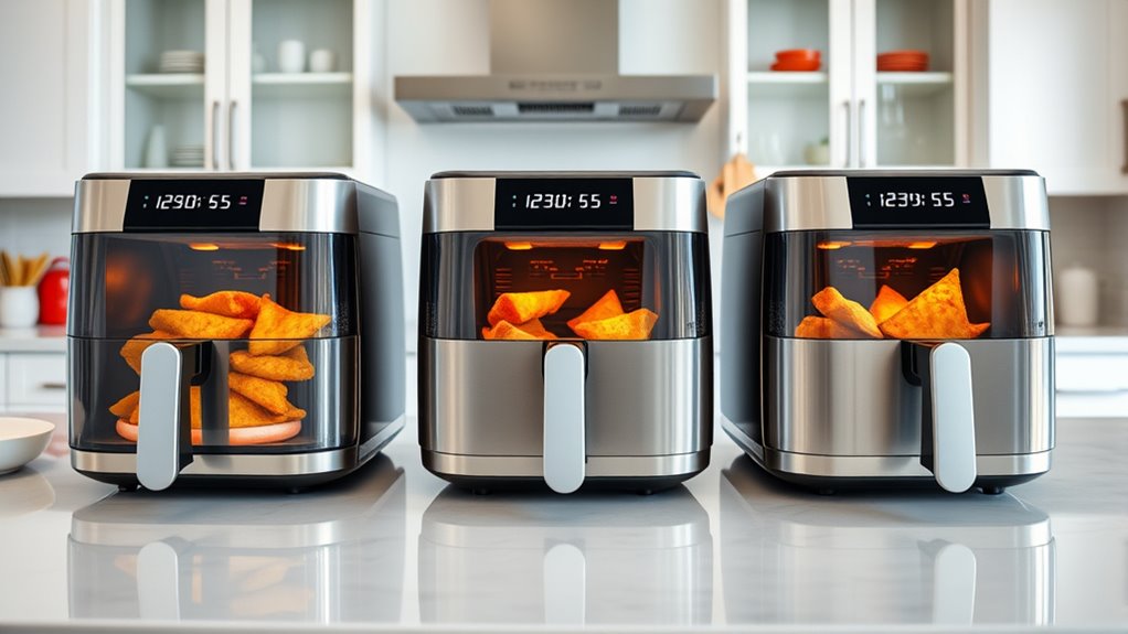 Think of large air fryers as fortress protectors in your kitchen. They include safety features like auto-shutoff, preventing overheating, and cool-touch exteriors to keep your hands safe. Many also have non-slip feet and secure lids or doors, ensuring stability during use. These features give me peace of mind, knowing my family’s meals are prepared safely, and I can focus on enjoying delicious, healthy food without worries.