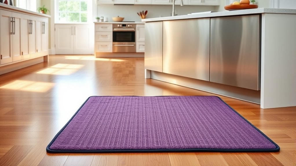 A key factor in selecting an anti-fatigue kitchen mat is ensuring it stays securely in place, especially in a busy or slippery environment. Look for mats with textured surfaces, like diamond-shaped or embossed patterns, as these boost grip and reduce fall risks. A non-slip backing made of rubber or PVC adds stability on various floors such as tile, wood, or marble. It’s also important to keep the underside clean and dry, since dirt or water can diminish grip over time. Safety certifications like CP65 or specific non-slip ratings indicate the mat meets industry standards for slip resistance. Choosing a mat with these features helps prevent slips and falls, keeping you safe and comfortable during your busy kitchen hours.