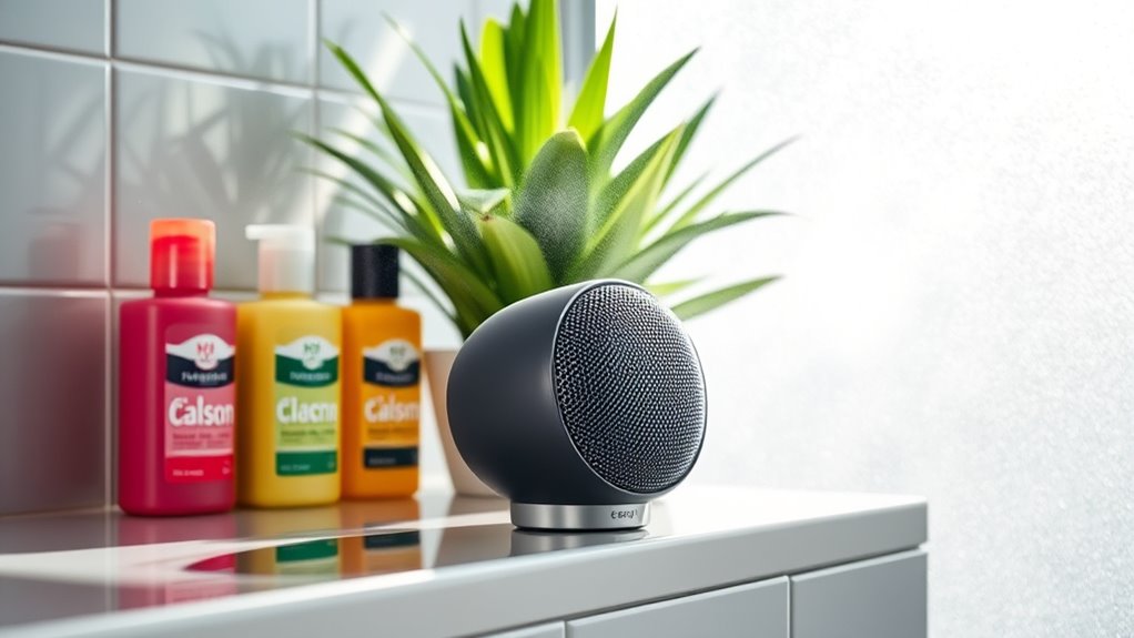 Ever noticed how vibrant lighting can boost your motivation during a shower or workout? Bright LED lights and RGB light shows create an engaging atmosphere that energizes me and makes routines more exciting. When lighting syncs with my music, it heightens my focus and stimulates my energy levels, turning a simple shower into a motivating experience. Customizable multi-color lights let me personalize my environment, making it more enjoyable and encouraging consistent use. Waterproof speakers with sealed LED displays ensure these lighting effects stay visible and functional, even in wet conditions. The dynamic visual appeal acts as a visual cue, keeping me motivated and helping me stay committed to my routine. Lighting and aesthetic effects are essential for transforming your shower into an energizing and inspiring space.
