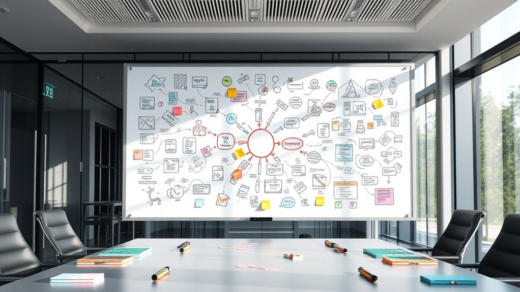 If you’re looking for the best brainstorming whiteboards of 2025, I recommend exploring options that combine portability, spacious surfaces, and versatile features like magnetic surfaces, adjustable stands, and easy-clean materials. Whether you need compact desktop boards, double-sided models, or stylish glass surfaces, there’s a perfect fit for your creative sessions. Choosing one that’s durable, user-friendly, and accessorized can boost your creativity. Keep going to discover detailed insights on these top picks that’ll elevate your brainstorming game.