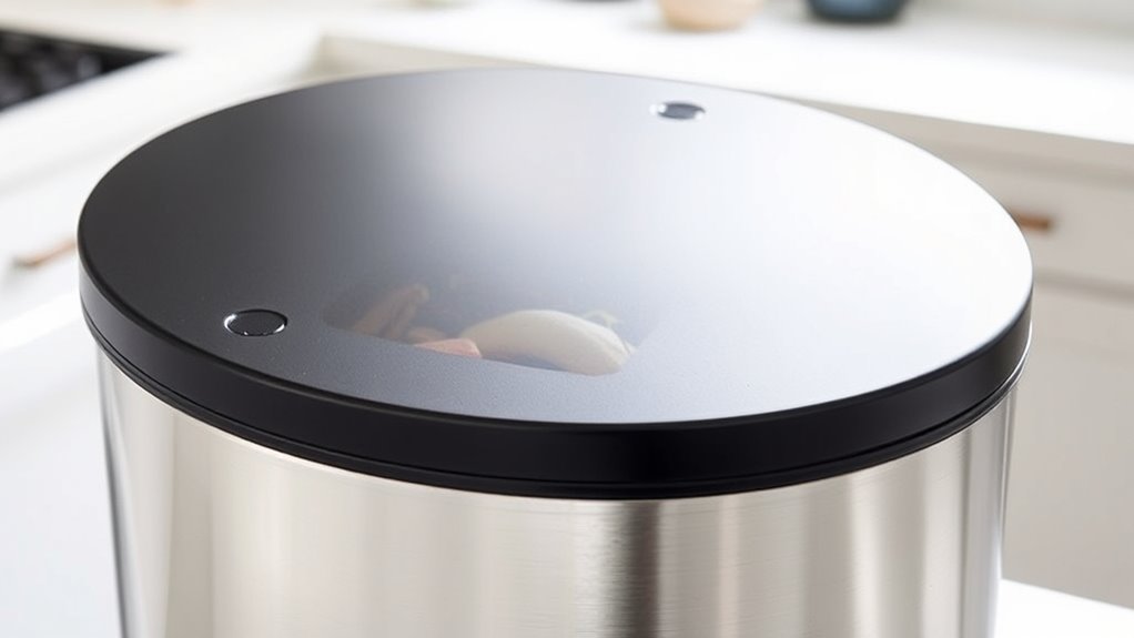 Since noise can disrupt the peaceful flow of your kitchen, paying attention to a compost bin’s sound levels is essential. Electric compost bins with noise levels below 40dba operate quietly enough to avoid disturbing your daily routine, even during early mornings or late nights. Features like insulated motors or sound-dampening materials help minimize operational noise, making the composting process more discreet. Excessive noise may signal mechanical issues or inefficient operation, so it’s important to choose a model known for quiet performance. Considering noise levels guarantees your compost bin integrates seamlessly into your kitchen environment without causing inconvenience or distraction. Ultimately, a quieter bin contributes to a more pleasant, peaceful space while simplifying your recycling efforts.