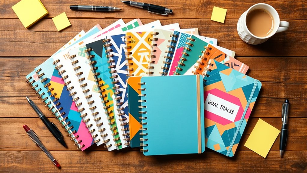 If you’re looking to hit your goals in 2025, I recommend exploring a range of goal-tracking planners that are flexible, stylish, and packed with useful features. From undated weekly planners with goal and habit trackers to detailed 90-day journals, there’s something for everyone. Whether you want portable A5 sizes or larger B5 options, these planners offer durability, motivation, and customization. Keep going, and I’ll share more about the best choices for your success journey.