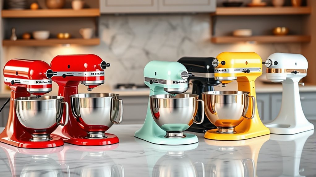 In 2025, staying on top of color trends can help you select a KitchenAid mixer that not only fits your style but also remains appealing over time. Pastel shades like blush pink, mint green, and soft lavender continue to be popular, adding a gentle touch to kitchens. Bold, vibrant hues such as electric blue, fiery red, and sunshine yellow are also trending, making a lively statement. Neutral tones like matte black, sleek white, and brushed stainless steel remain timeless choices for versatile decor. Metallic finishes, including rose gold and bronze, are gaining popularity as luxurious accents. Additionally, customization and limited-edition colors let you personalize your mixer, ensuring it matches your evolving interior style while standing out as a unique piece.