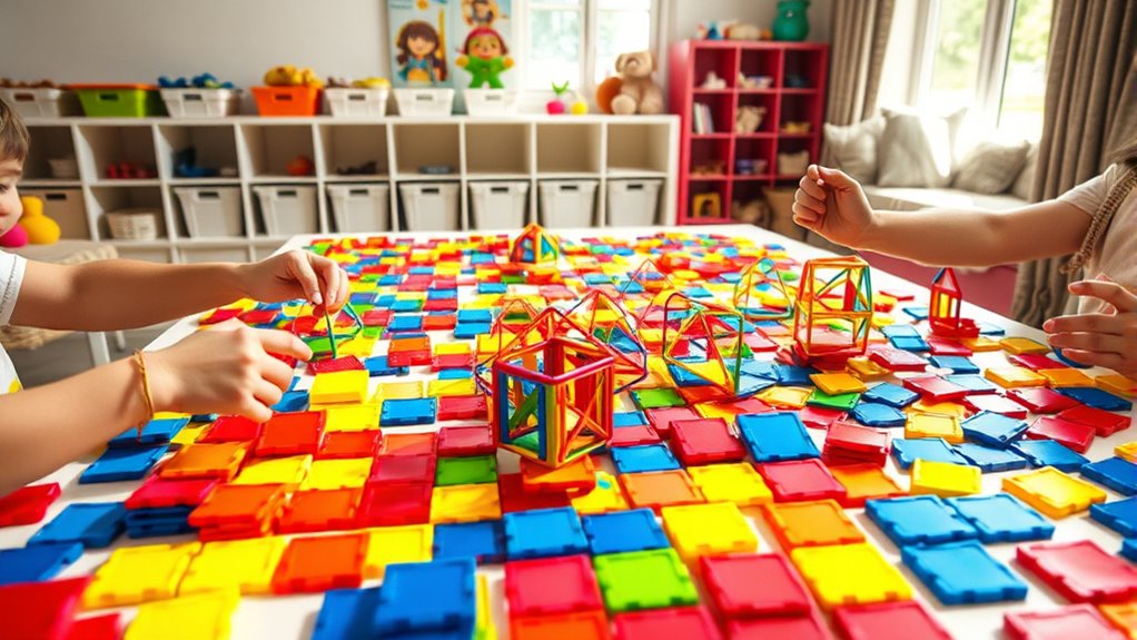 I recommend storing magnetic tiles in a sturdy, divided storage bin or a clear plastic container with compartments. This keeps pieces organized and easy to find, preventing them from getting lost or damaged. I also suggest using a portable caddy for added convenience, especially for quick clean-ups or travel. Regularly sorting and inspecting the tiles guarantees they stay in great condition and are ready for imaginative play whenever your child wants to build.