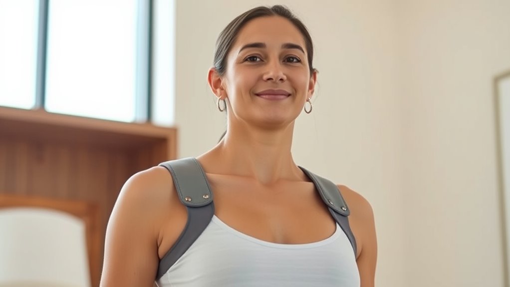 When looking for a posture corrector that remains discreet under clothing, it’s important to contemplate the materials and design features that help it blend seamlessly with your attire. Slim, low-profile materials like mesh or elastic knit ensure the brace stays lightweight and breathable, preventing bulkiness. Adjustable straps and sleek designs allow for a snug fit that adapts to various clothing styles, from formal to casual or athletic wear, without drawing attention. Minimal bulk around the shoulders and back ensures no noticeable lines or protrusions show through your clothes. Proper sizing and flexible materials help maintain a close yet comfortable fit, so you can wear your corrector confidently during daily activities without feeling self-conscious. Discreet braces truly make a difference in maintaining good posture without sacrificing style.
