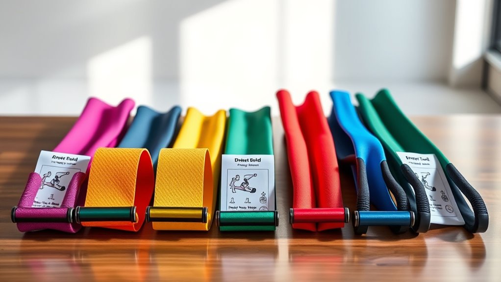 If you’re looking to boost your workout, I recommend checking out the 14 best resistance-band sets with guides. These sets often include varying resistance levels, handles, ankle straps, and door anchors to target all muscle groups. Plus, they come with detailed instructions or workout routines to help you exercise safely and effectively. Whether you’re a beginner or an advanced user, these guide-supported options will keep you motivated and progressing. Keep exploring to find the perfect fit for your fitness goals.