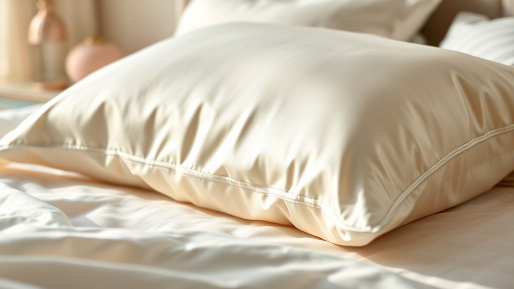 Selecting the right size and fit for your silk pillowcase guarantees you get the best benefits for your hair and skin. It’s important to match the pillowcase size to your pillow dimensions—whether standard, queen, or king—to guarantee a proper fit. A well-fitting pillowcase prevents slipping and bunching, which can disrupt your sleep and cause unnecessary friction. Features like hidden zippers or envelope closures help keep the pillow secure, maintaining a smooth surface throughout the night. Proper sizing also protects the silk fabric from stress and damage caused by over-stretching. When your pillowcase fits perfectly, it stays in place, reduces excess movement, and creates a wrinkle-free surface that enhances comfort and maximizes the skin and hair benefits silk offers.