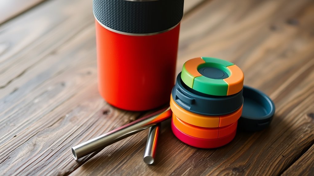 To elevate your hydration game, I recommend Stanley Tumbler Replacement Straws for a durable, eco-friendly upgrade, Silicone Straw Toppers for a fun, secure seal, and the Quencher Tumbler Cover Cap & Accessory Set for added protection and style. These accessories are made from high-quality, BPA-free materials and designed to last. If you want to learn about the best options to enhance your tumbler experience, stay tuned for more insights.