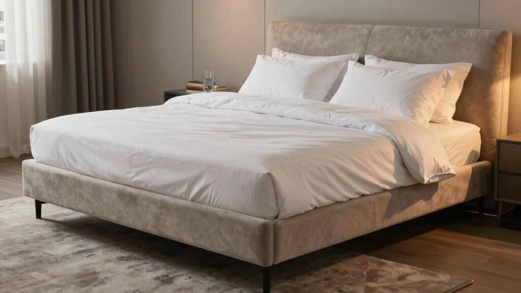 Adjustable beds don’t require special bedding or sheets, but bedding compatibility and sheet fit are important. Choose sheets with deep pockets or stretchy materials to guarantee they stay in place when the bed adjusts. Look for fitted sheets designed for adjustable beds, which have flexible edges to accommodate movement. This way, you get a comfortable sleep experience without worrying about your sheets slipping off or bunching up during adjustments.