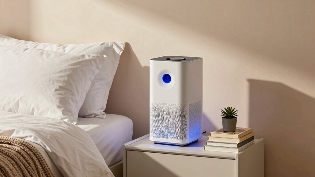 Air purifiers can produce some noise, but many models generate a white noise that can actually help you sleep better. If you’re concerned about sleep disruption, choose a purifier with a quiet or sleep mode setting, which minimizes sound levels. This white noise can mask disruptive sounds, promoting more restful sleep. Just make certain your device is quiet enough to avoid disturbing your sleep rather than enhancing it.