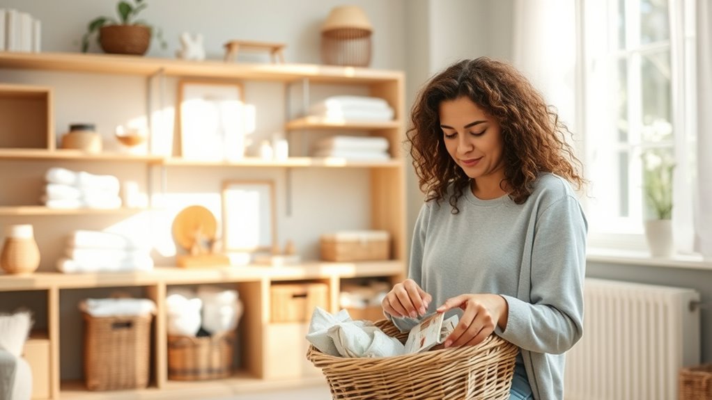 About 80% of people feel overwhelmed by sentimental attachments during decluttering, as emotional triggers surface. If you’re feeling overwhelmed, take small steps—start with items that hold less emotional weight. Remember, it’s normal to feel this way, and you don’t have to part with everything at once. Focus on preserving meaningful items, and consider asking a friend for support. Your emotional well-being is the priority in this process.