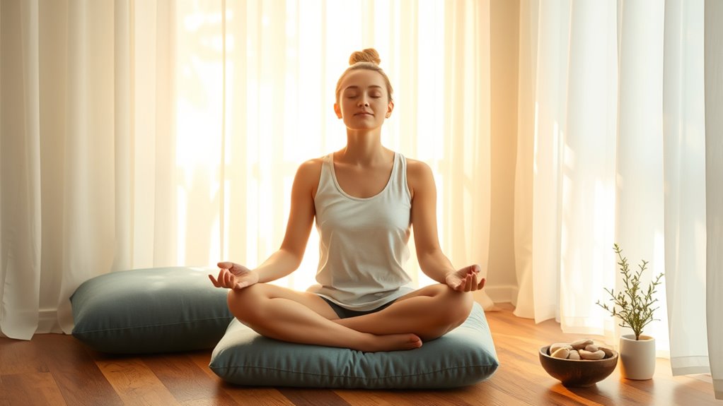 You should create a calming meditation space with ambient lighting to enhance your practice. Find a quiet, clutter-free area where you won’t be disturbed, and set up a comfortable seat or cushion. Dim the lights or use soft, warm lighting to promote relaxation. This environment helps you focus, reduces distractions, and makes it easier to immerse yourself in your guided meditation, ultimately boosting its effectiveness for anxiety relief.