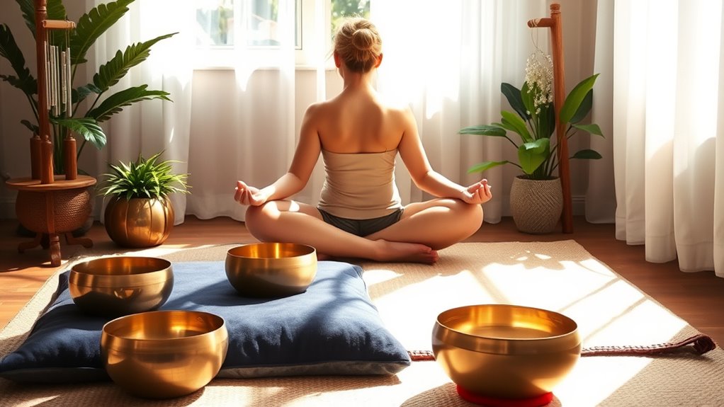 Sound healing acts like a gentle tide, washing over your mind and soothing stress. Through resonance therapy and vibrational healing, it helps reduce anxiety and improve mood by aligning your mental state with calming frequencies. This process stimulates your brain’s natural relaxation response, fostering mental clarity and emotional balance. By tuning into these vibrations, you create a sanctuary within, where mental health can flourish, and inner peace takes root.