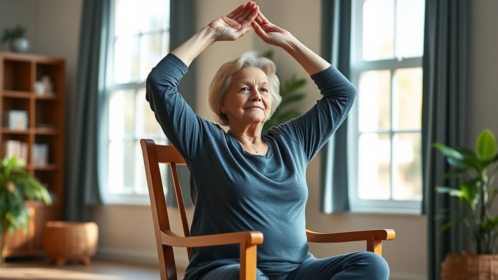 If you’re experiencing arthritis discomfort, chair yoga can be a gentle way to improve joint flexibility without stressing your joints. You should check with your healthcare provider first, but many seniors find it helpful for easing stiffness and maintaining mobility. The slow, controlled movements help you stay comfortable, making it a suitable option for those with arthritis. Just listen to your body and adapt poses as needed for maximum comfort.